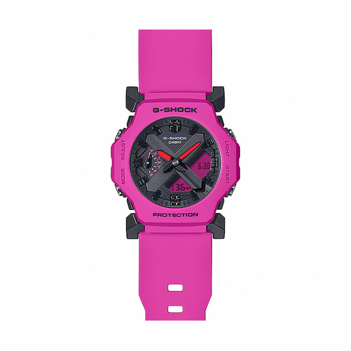 De Casio GA-2300-4AER is een uniseks horloge dat functionaliteit en stijl combineert in één polshorloge. Met een opvallende roze horlogekast en roze band, in combinatie met een zwarte plaat, is dit horloge een blikvanger om de pols.
